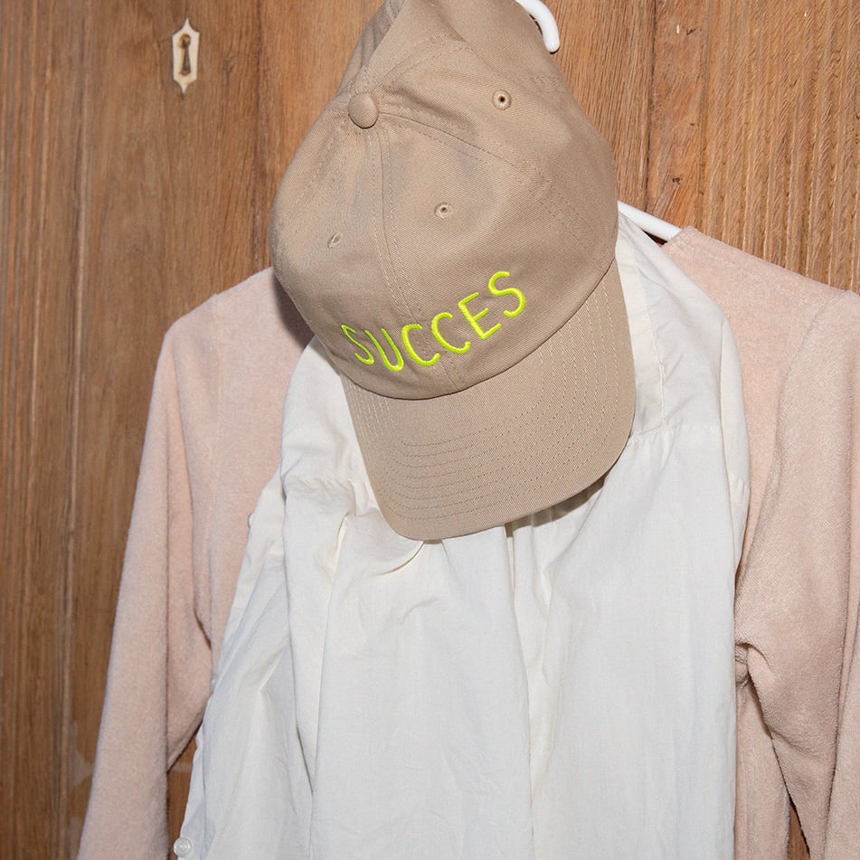 NEW! Our SUCCES cap in sand with neon yellow embroidery. Be neutral and neon, all at once!